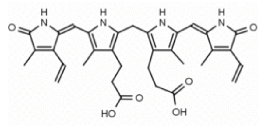 Bilirubin consists of an open-chain tetrapyrrole. It is formed by cleavage of a porphyrin in heme, which affords biliverdin. Biliverdin is reduced to bilirubin. After conjugation with glucuronic acid, bilirubin is water-soluble and can be excreted (Wikipedia). Bilirubin is usually found in animals but also in some plants, Strelitzia nicolai, is known to contain that lipid pigment in arils and flowers (Pirone C et al., J Am Chem Soc 2009, 131 (8): 2830). Later, bilirubin was shown to be present in eight species from the orders Zingiberales, Arecales and Myrtales, but only contributed to colour in species within the Strelitziaceae (Pirone C et al., AoB Plants 2010, plq020).